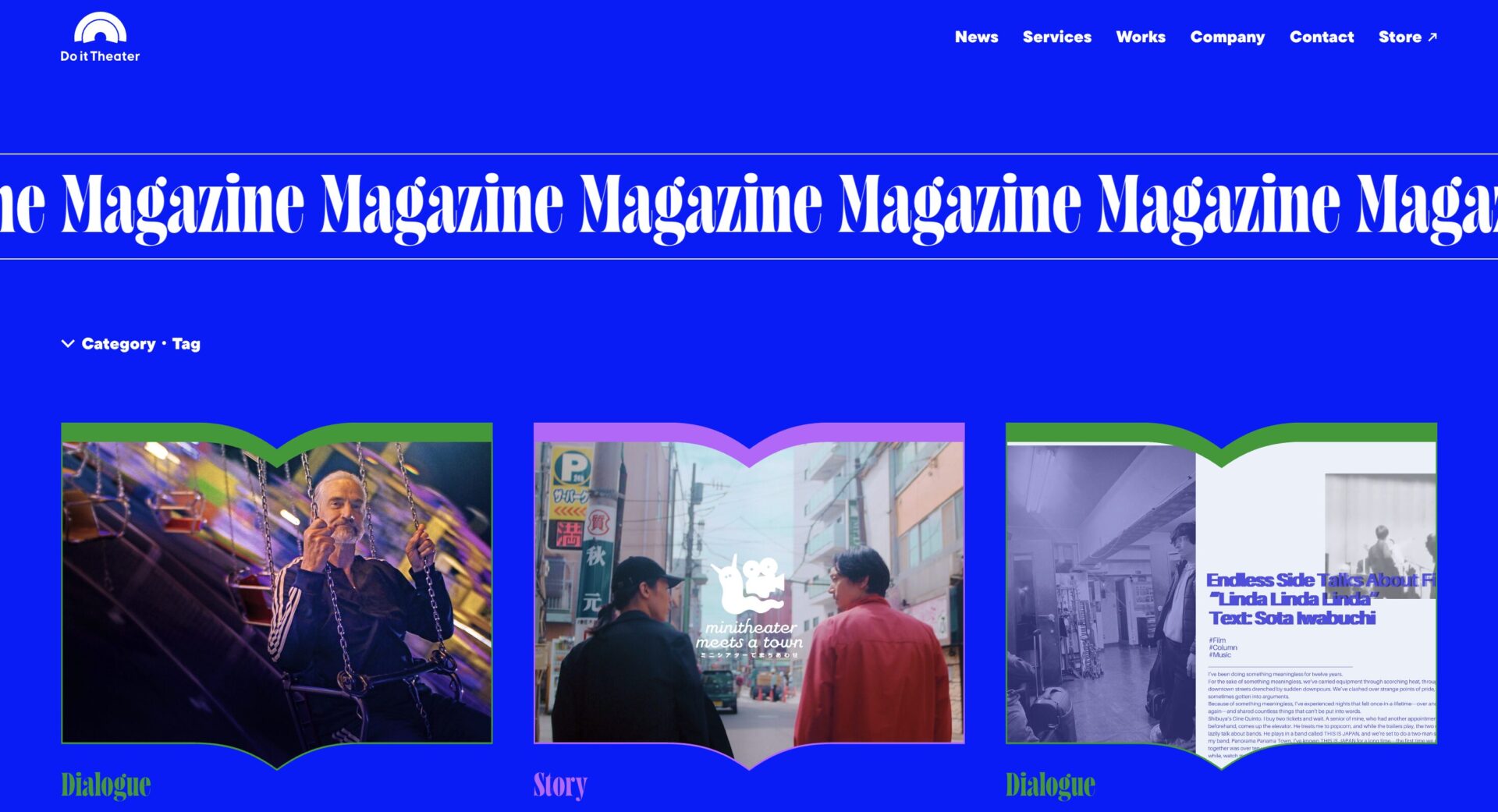さらに、「Do it Theaterの世界観や活動の軌跡を伝えていきたい」というご要望から、Campがこれまでにメディア制作で培ったノウハウをもとに「Magazine」ページを設置。インタビューやコラムが読める「Dialogue」、イベントレポートなどをまとめた「Story」といったコーナーをつくり、WordPressによって自らコンテンツ発信できる仕組みをとることで、コンテンツの充実も計りました。
